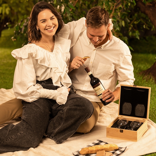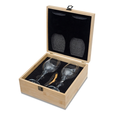 Eleganta dāvanu kaste ar divām izsmalcinātām 310 ml vīna glāzēm un stila korķuvi, kas ievietoti skaistā bambusa kastē. Glāžu smalkā forma izceļ vīna garšu un aromātu, padarot šo komplektu par ideālu dāvanu vīna cienītājiem un elegantu aksesuāru mīļotājiem.