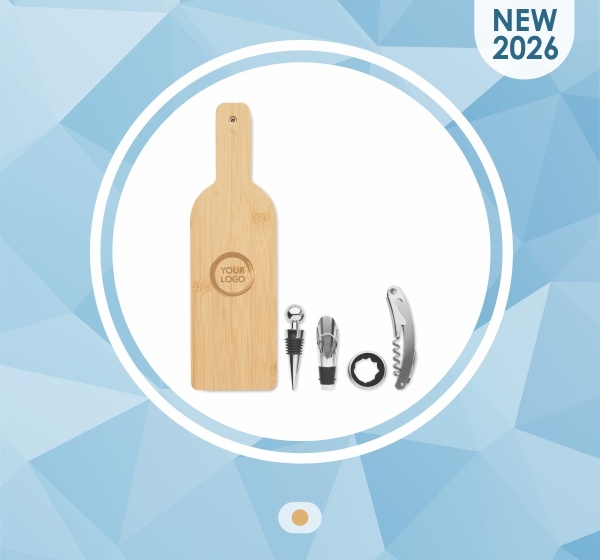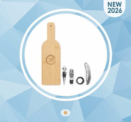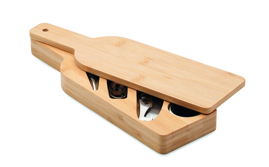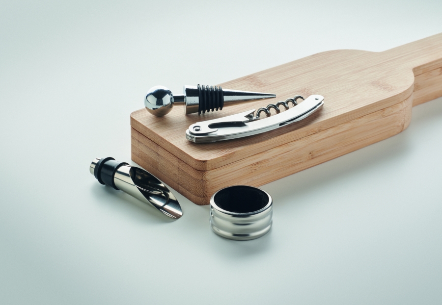 Elegants vīna piederumu komplekts bambusa futrālī, kas veidots vīna pudeles formā. Komplektā ietilpst korķuviļķis, vīna lejamais uzgalis, pudeles aizbāznis un pilienu gredzens.